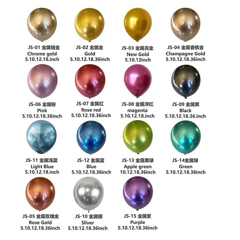 Upang matugunan ang magkakaibang mga pangangailangan ng aming mga customer, nakabuo kami ng apat na mga subkategorya batay sa mga pangunahing katangian ng 1.8g metallic balloon, na sumasakop sa lahat ng mga sitwasyon mula sa pang-araw-araw na dekorasyon hanggang sa high-end na pagpapasadya.