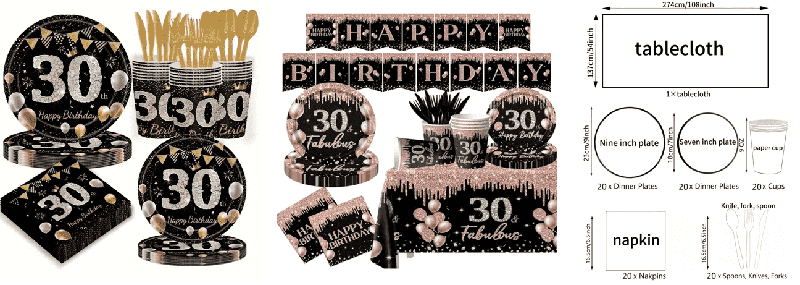 Ang Paper Birthday Card ay ang pangunahing dekorasyon ng cake: ang pangunahing kard ay batay sa mga salita tulad ng "Maligayang ika -30 Kaarawan" at naitugma sa hugis ng Champagne Cup. Ang laki ay malaki at angkop para sa dekorasyon ng pangunahing cake. Mayroon ding mga pabilog na logo na "30", mga bituin, korona at iba pang maliliit na kard, na angkop para sa mga cupcakes, na gawa sa makapal na matigas na karton, na may mga kawayan ng kawayan sa ibaba, na maaaring maipasok para magamit.