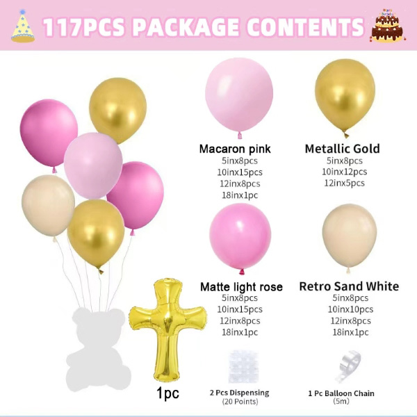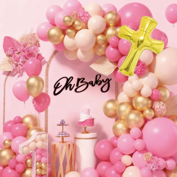 Ang baby shower balloon arch kit ay may dalawang istilo, isang istilo ay para sa mga batang babae at isang istilo ay para sa mga batang lalaki. Ang baby girl set ay gawa sa macaron pink color balloon, matte light rose color balloon, matte light skin color balloon, metallic gold color balloon at gold god bless cross. Ang baby boy set ay gawa sa macaron blue color balloon, retro sea blue color balloon, matte light skin color balloon, metallic gold color balloon at gold god bless cross. Pareho silang may pandikit na tuldok at balloon trip, maaari mong gamitin ang mga ito upang makagawa ng isang buong magandang garland.