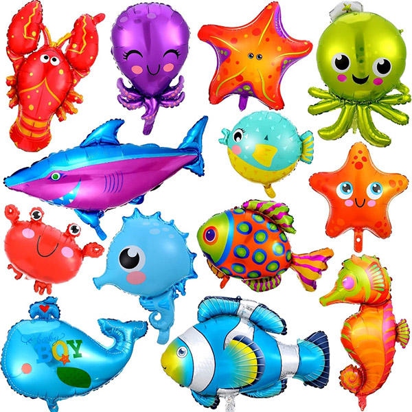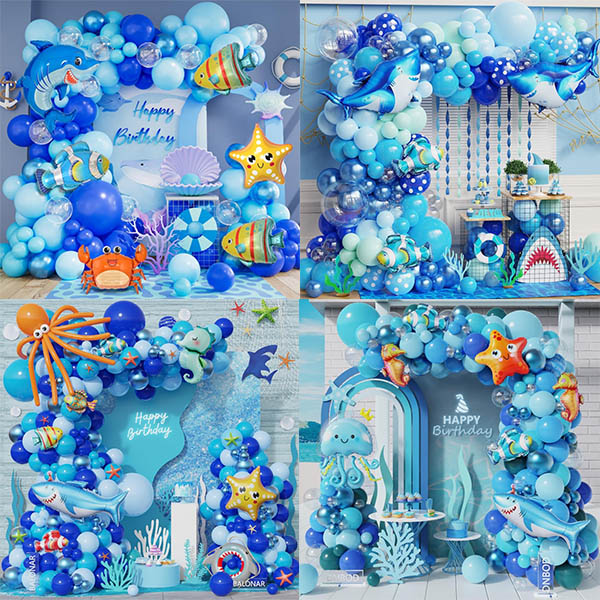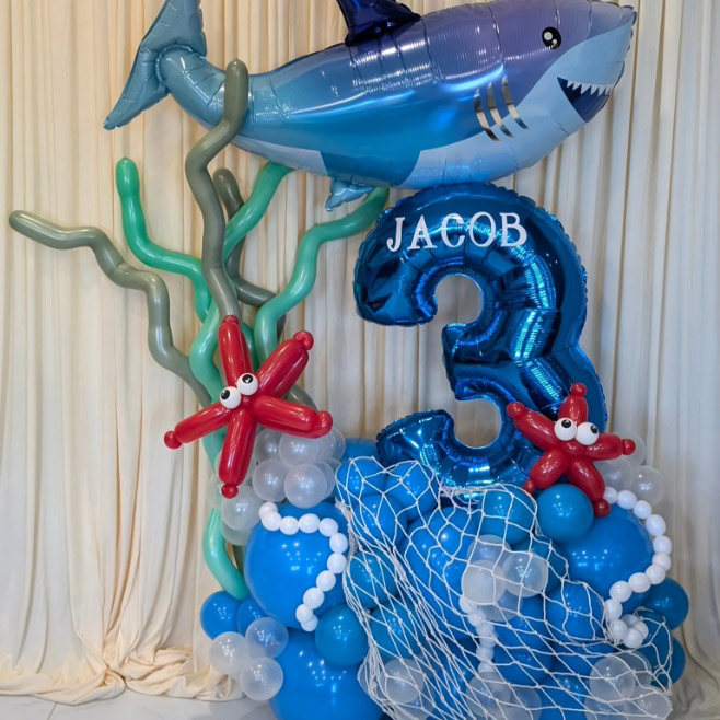 2. Foil Balloon:Balloon Garland na may Shark Foil Balloons, ang package na ito ay nilagyan ng mga foil balloon na may iba't ibang mga nilalang na cartoon marine, tulad ng mga pating, starfish, dikya at seahorses. Bilang karagdagan, maaari rin kaming magdisenyo ng mga pasadyang foil balloon para sa iyo ayon sa iyong pattern upang lumikha ng isang natatanging balloon garland na may mga shark foil balloon.