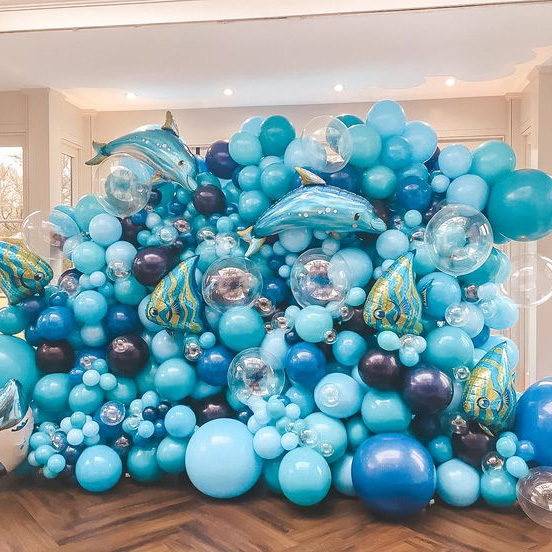 3.Modeling Balloon:Sa lobo garland na may mga shark foil balloon, ang pagmomolde ng lobo ay maaaring humubog ng iba't ibang mga hugis at maaaring pagsamahin sa latex balloon upang makabuo ng isang imahe ng pugita. Kasabay nito, maaari mo ring gamitin ang iyong imahinasyon upang lumikha ng anumang uri ng nilalang sa dagat na gusto mo.