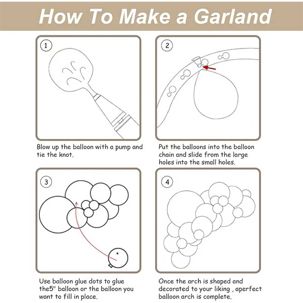 Pansin at Babala:Mangyaring HUWAG mag-overfill ang mga lobo at iwasan din ang sunburn, sobrang init, matulis na bagay at labis na alitan. Kontrolin ang dami ng hangin na na-inflated sa bawat balloon para makuha ang iyong perpektong laki ng balloon, i-enjoy ang iyong Balloon Garland Arch kits party.