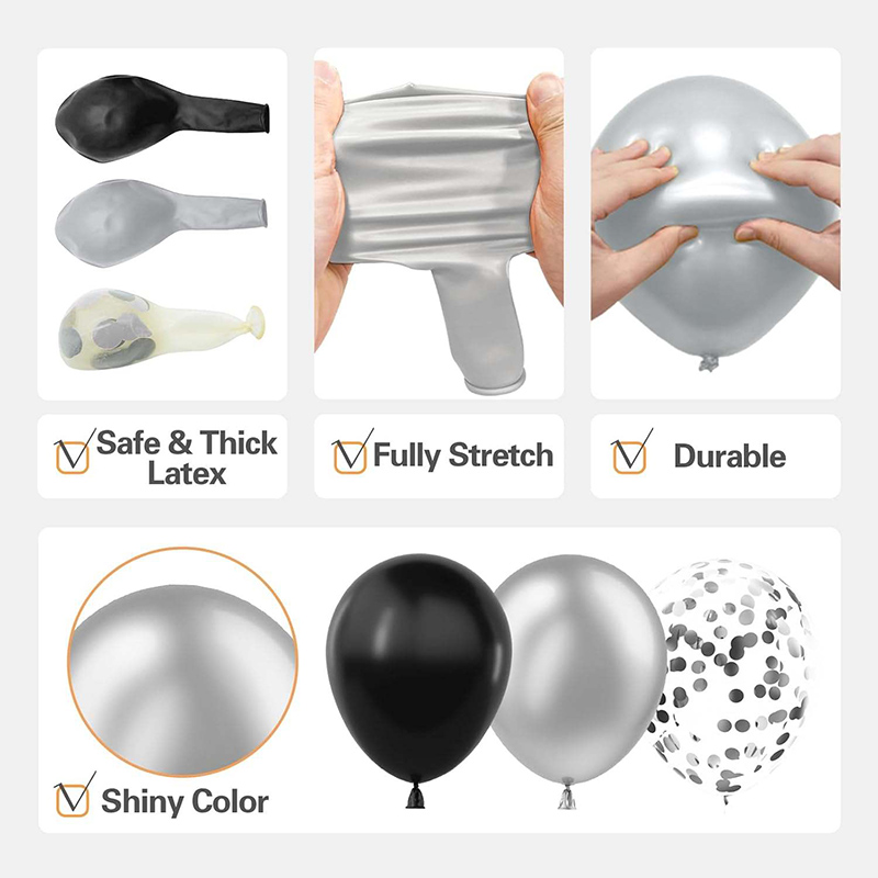 Ang mga dekorasyon ng fashion black at pilak na balloon kits ay madalas na gumagamit ng mga losa ng latex. Mayroon silang iba't ibang laki. Ang mga kulay ay matte itim at metal na pilak. Mayroon silang malinaw na mga layer at magandang pagtutugma na lumiwanag. Ang buong hitsura ay puno at tatlong-dimensional. Ang mahusay na kalidad ng latex ay ginagawang mabaluktot at makinis ang mga lobo. Hindi sila madaling sumabog. Kahit na matagal nang nakalagay, nananatili silang buo at bilog. Hindi sila tumagas ng hangin o madali ang pagkawala ng kulay. Ang ilang mga set ay mayroon ding mga foil balloon. Ang mga ito ay nagdaragdag ng isang mapanimdim na hitsura. Ginagawa nilang mas makintab ang buong dekorasyon at may magandang pakiramdam. Nagpapakita sila ng isang magarbong modernong istilo.
