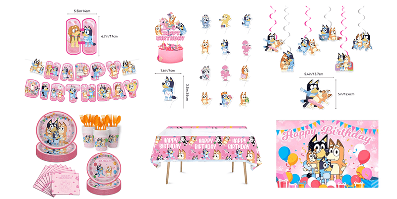 Ang Paper Birthday Topper ay ang pangunahing dekorasyon ng cake. Ang pangunahing kard topper ay tumatagal ng bluey na character na tema bilang pangunahing katawan, habang ang maliit na kard topper ay tumatagal ng bluey animation character, na ginagamit na interspersed na may mga cake, mga sumbrero sa kaarawan, atbp.