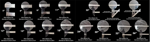 Ang mga transparent bobo balloon ay magagamit sa iba't ibang laki, na nakalista dito. Ang iba't ibang laki ay tumutugma sa iba't ibang mga modelo at ang kanilang pangkalahatang napalaki na mga sukat. Maaari mong ipasadya ang iyong laki nang naaayon.