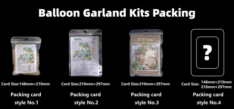 Para sa balloon kits packing, kung i-customize lang ang packing card, ang moq ay 50sets, kung custom ang outer carton ang moq ay 500pcs.