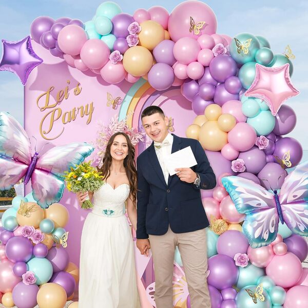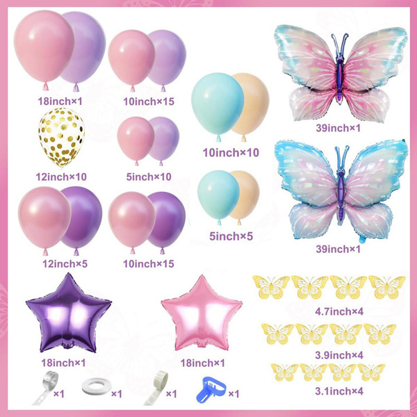 Butterfly Balloon Arch Kit : Ang arch kit ay makulay at kapansin-pansin, binubuo ito ng iba't ibang mga foil balloon at latex lobo. Kapag ayusin ito, magdagdag ng isang background board na may mga pattern at iba't ibang teksto, at pagkatapos ay palibutan ang mga lobo sa paligid nito. Ito ang tagalikha ng kapaligiran sa kaganapan. Ang pagkuha ng mga larawan sa harap nito ay magiging napakaganda.