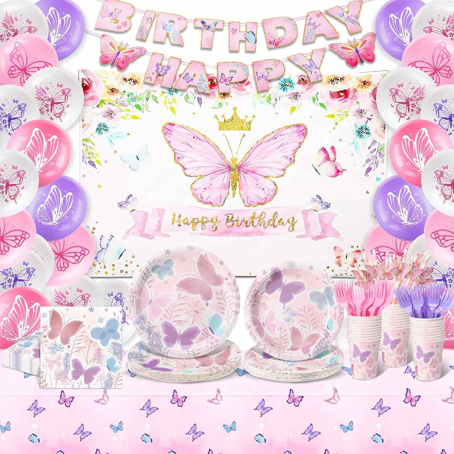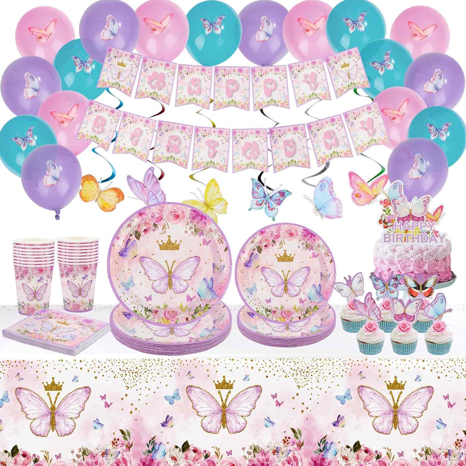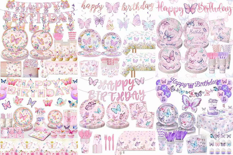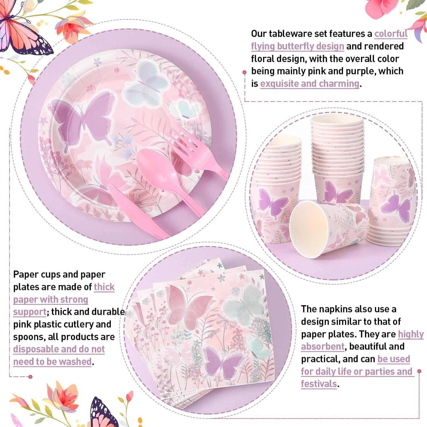 Ang isang mahusay na pagpipilian para sa dekorasyon ng party ay ang butterfly party tableware set. Kasama ang mga napkin, paper plate, paper cup, tinidor, at kutsilyo. Ang bawat piraso ay nagpapakita ng mga bahagi ng butterflies.