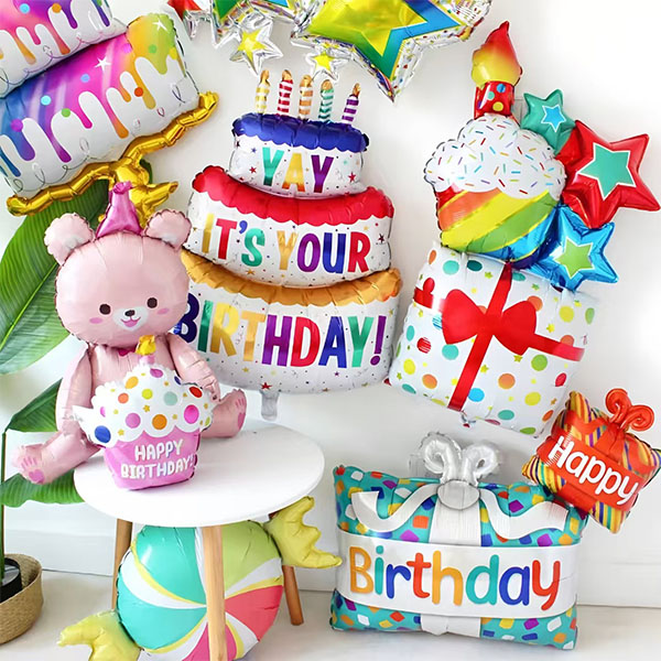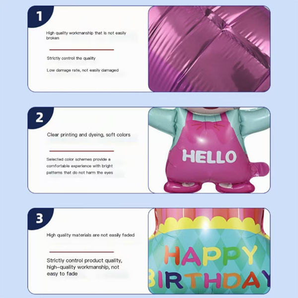 Ang mga cake na hugis foil na lobo ay maraming uri. Dumating sila sa iba't ibang mga hugis, layer at estilo. Mayroong simpleng tatlong layer matte cake na hugis foil balloon. Mayroon itong pekeng kandila. Mukhang matikas. Mayroong makulay na tatlong layer cake na hugis foil balloon. Gumagamit ito ng mga maliliwanag na kulay tulad ng pula, orange at lila. Ay may mga pattern ng bituin. Puno ng enerhiya. Mayroong dalawang layer polka dot cake na hugis foil balloon. Mayroon itong mga gilid ng rainbow cream at may kulay na tuldok. Napaka -tulad ng bata. Mayroon ding mga malikhaing may mga character na cartoon. Tulad ng Bear Holding Cake Foil Balloon, Bear Hugging Cupcake Foil Balloon at iba pa. Hinahalo nila ang mga elemento ng cake na may mga cute na hugis. Matugunan ang mga pangangailangan sa dekorasyon para sa iba't ibang mga eksena. Tulad ng mga kaarawan ng kaarawan at pagdiriwang. Magdagdag ng mga natatanging visual highlight sa bawat masayang sandali.