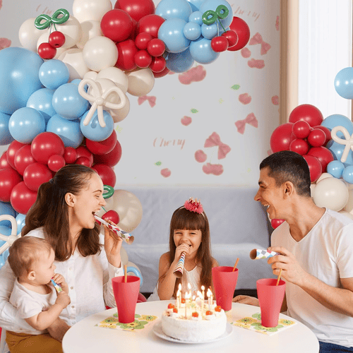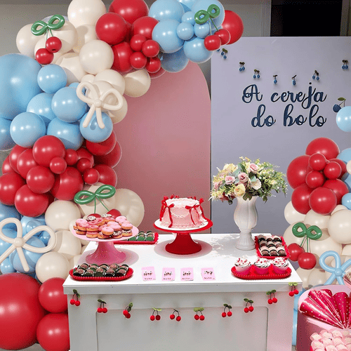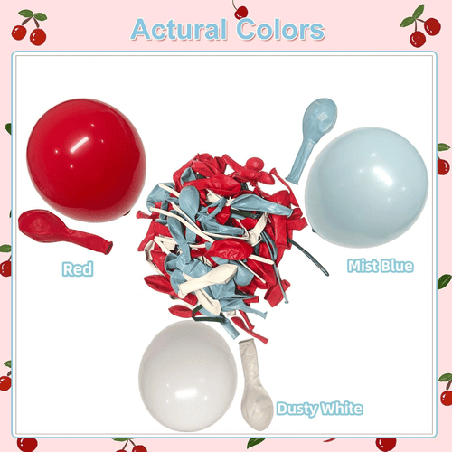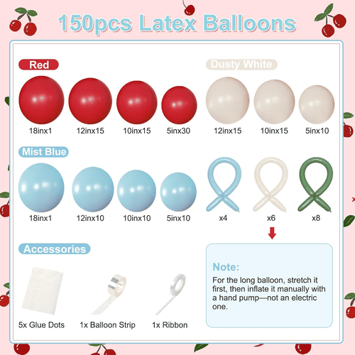 Ang cherry blossom balloon arch ay may iba't ibang latex balloon, kabilang ang round latex balloon at long latex balloon. Ang kabuuang istilo ng kit ay positibo at maganda, ito ay minamahal ng mga customer sa buong mundo. Ang mga kulay ng round latex balloon ay pula, dusty white at mist blue. At para sa long latex balloon ay mist blue, dusty white at green, ang long latex balloon ay ginagamit para gawin ang bow tie style at ang cherry style.