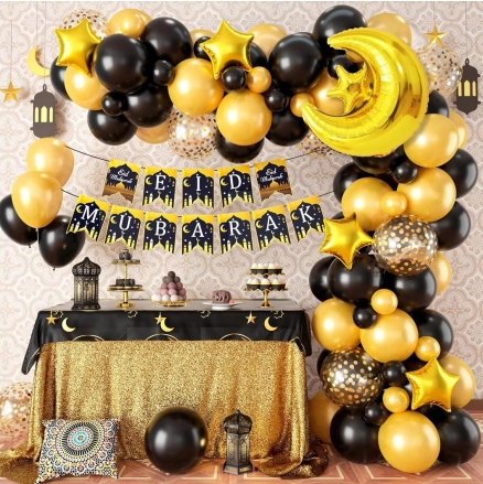 Ang Niun® Brand Eid al-Fitr Balloon Garland Kits ay karaniwang naglalaman ng iba't ibang mga item, tulad ng Eid-temang latex lobo at foil balloon ng iba't ibang laki at kulay, backdrop, tablecloth, mga linya ng pangingisda, mga chain ng lobo, mga pandikit na pandikit, manu-manong o electric pump, atbp. Iba't ibang mga pangangailangan ng mga mamimili.
