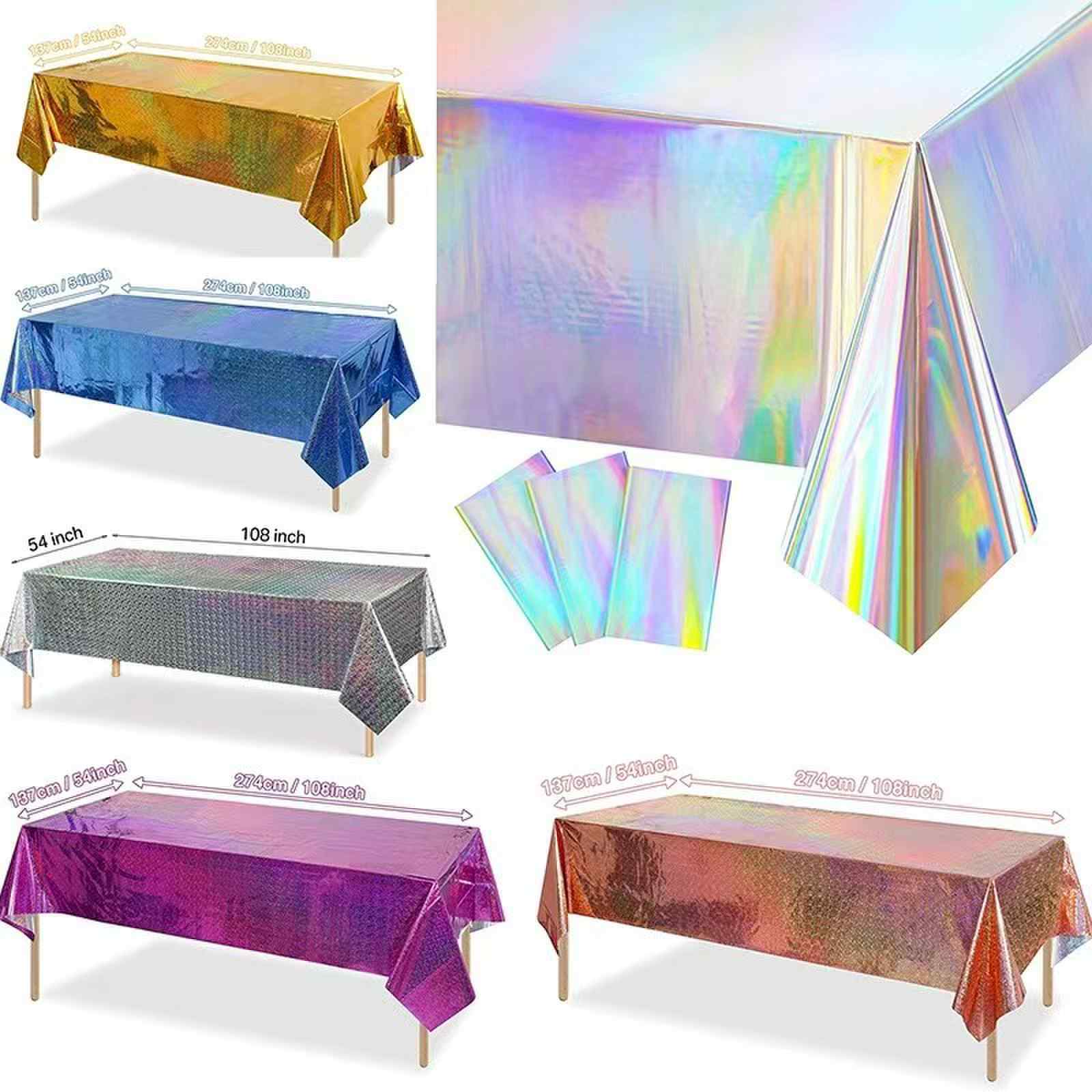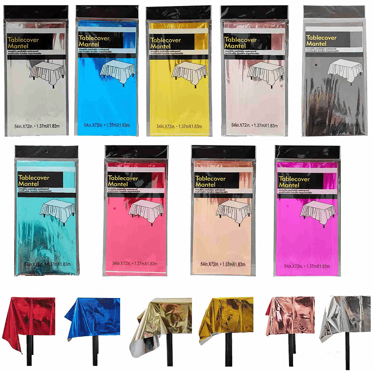 Ang mga karaniwang laki ng tablecloth ng foil ay 1.37*1.83m, 1.37*2.74m at 1*2.7m para sa mga talahanayan ng sambahayan at maliit at katamtamang laki ng partido. Ang ilang mga produkto ay maaaring ipasadya ang laki ng tablecloth ng foil at pattern ayon sa mga kinakailangan ng customer upang matugunan ang mga kinakailangan sa layout ng desktop ng iba't ibang mga eksena.
