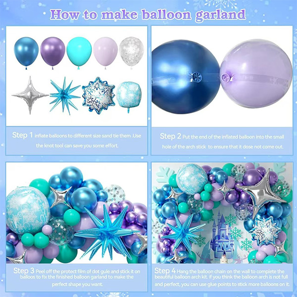 Bukod sa mga regular na lobo, ang kit ay nagsasama ng maraming mga elemento na hugis ng tema. Mayroong malaking mga lobo ng snowflake foil. Mayroon silang pinong mga texture. Ang mga ito ay tulad ng mga mahiwagang snowflake na nilikha ni Elsa sa pelikula. Maaari mong gamitin ang mga ito upang makabuo ng isang arko. Maaari mo ring gamitin ang mga ito upang palamutihan ang isang pader ng background. Ang mga kulay na ito ay magkasama. Agad silang lumikha ng isang kapaligiran tulad ng pagiging nasa isang kaharian ng yelo at niyebe.