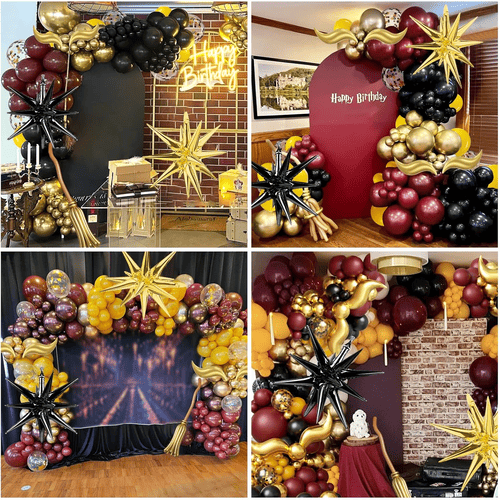 Ang latex balloon sa Harry Potter themed balloon arch ay gawa sa 100% raw latex na inangkat mula sa Southeast Asia. Dahil natural na materyal ang mga ito, ganap silang eco-friendly at hindi nakakapinsala para sa mga bata at matatanda. Ang kanilang mga kulay ay simbolikong kulay ng mga pelikulang Harry Potter, kabilang ang wine red, yellow, black at gold. Upang magdagdag ng higit pang mga layer, idinagdag din namin ang confetti balloon, ang confetti ay metallic gold.
