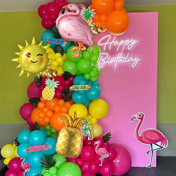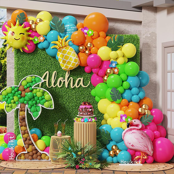 Maaari naming ipasadya ito sa iyong sariling tema, pagpili ng iyong sariling natatanging palette ng kulay. Halimbawa, ang pagdaragdag ng ilang mga lobo na may temang retro ay lilikha ng isang tropikal at maligaya na kapaligiran para sa iyong lugar, pagdaragdag ng isang ugnay ng kaakit-akit sa iyong Hawaiian Balloon Garland Kit.