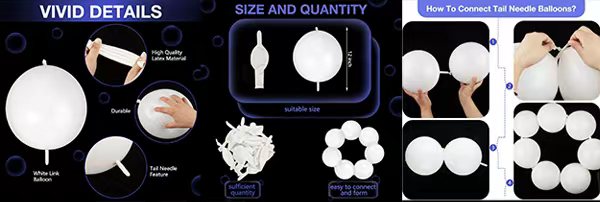 Ang mga latex na balloon na ito ay malawakang ginagamit upang lumikha ng mga kadena ng lobo, mga lambat ng lobo, mga backdrops ng lobo, at mga arko ng lobo, na ginagawa silang perpektong karagdagan sa mga partido sa pagtatapos, anibersaryo, at iba pang pagdiriwang. Ang mga balloon ng fashion tail ay nababaluktot at ligtas, angkop para sa karamihan ng mga tao. Ang aming mabilis na mga lobo ng link ay nakatayo kasama ang kanilang natatanging disenyo ng end-to-end, tinanggal ang pangangailangan para sa mga tool. Kumpara sa tradisyonal na mga lobo, ang proseso ng lobo ng link ay mas simple at mas mabilis, na nagpapahintulot sa iyo na palamutihan ang iyong partido o lugar ng kaganapan nang mas mahusay.