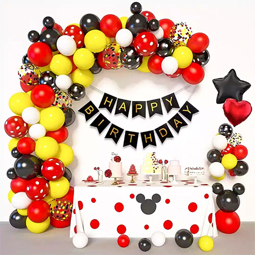 ItoMickey Mouse balloon garland archay pangunahing magagamit sa pink at pula na serye, kabilang angmga lobo ng latex, mga lobo ng foil, mga banner ng papel ng kaarawan, mga kurtina ng foil at iba pang mga accessories. Ang lahat ng mga accessories ng package na ito ay may magandang kalidad.