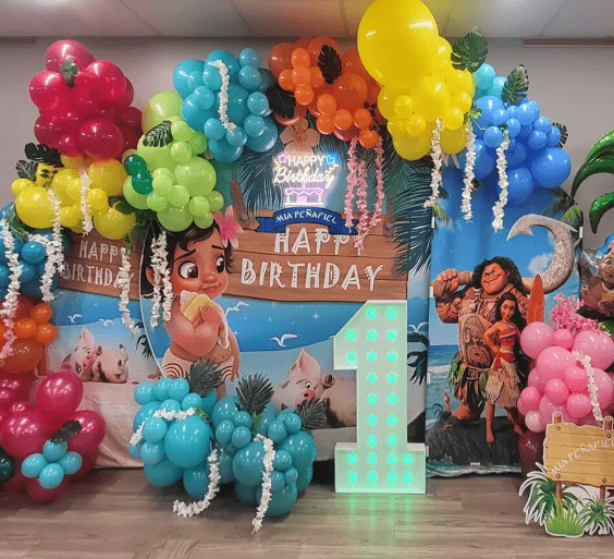 Ang Moana balloon arch ay gumagamit ng color system ng ocean blue, beach gold at island green, na perpektong nagpapanumbalik ng scene atmosphere sa "Ocean Wonder. Ang tatlong kulay ay magkakaugnay at naiiba, na nagpaparamdam sa mga kalahok na parang nasa dream island sila sa South Pacific at mabilis na naisasama sa theme atmosphere ng event.