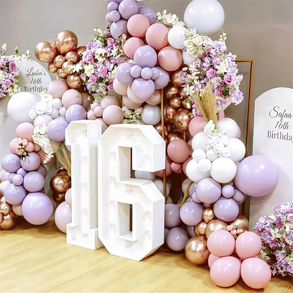 Ang ika-16 na kaarawan ay tinatawag na matamis na labing-anim at ito ay isang monumental na punto ng paglago, na sumisimbolo sa karagdagang paglipat mula sa pagkabata hanggang sa pagdadalaga. Para mas matulungan ang mga pamilya na magdaos ng mga party para ipagdiwang ang espesyal na araw na ito, espesyal na inilunsad ng aming pabrika ang isang matamis na 16 balloon arch upang matugunan ang mga pangangailangan sa pagbili ng mga consumer. Ang garland arch set na ito ay binubuo ng mga latex balloon, foil balloon, birthday banner, balloon box, glue point at iba pang accessories. Ang aming mga latex balloon ay gawa sa natural na goma, ang mga foil balloon ay gawa sa mataas na kalidad na aluminum foil na materyal, at ang bawat hanay ng ika-16 na dekorasyon ng kaarawan ay maingat na siniyasat upang matiyak ang pinakamataas na kalidad ng mga pamantayan. Ang lobo ay matibay, lumalaban sa pagsabog, walang kamali-mali at angkop para sa parehong pagpuno ng hangin at helium. Bilang karagdagan sa balloon arch na ito, gumawa din kami ng balloon garland arch na may 16 na led light. Ang 16 na led light ay ginagawang mas kapansin-pansin ang iyong kaarawan, at mayroong tatlong mga mode gaya ng led na mapagpipilian. Mayroon din kaming 16 taong gulang na birthday printing latex balloon set. Ang set na ito ay karaniwang ginagamit sa 12inch na latex balloon. Ang pattern ay malinaw at hindi madaling masira. Maaari itong magamit nang mahabang panahon. Nilikha namin ang mga paketeng ito upang matugunan ang iyong mga pangangailangan para sa iba't ibang at malalaking okasyon sa parehong oras, na nagdaragdag ng isang masayang kapaligiran sa iyong party.